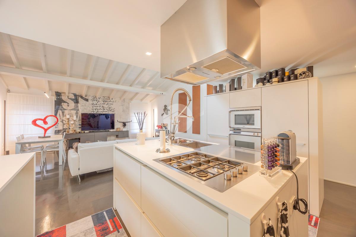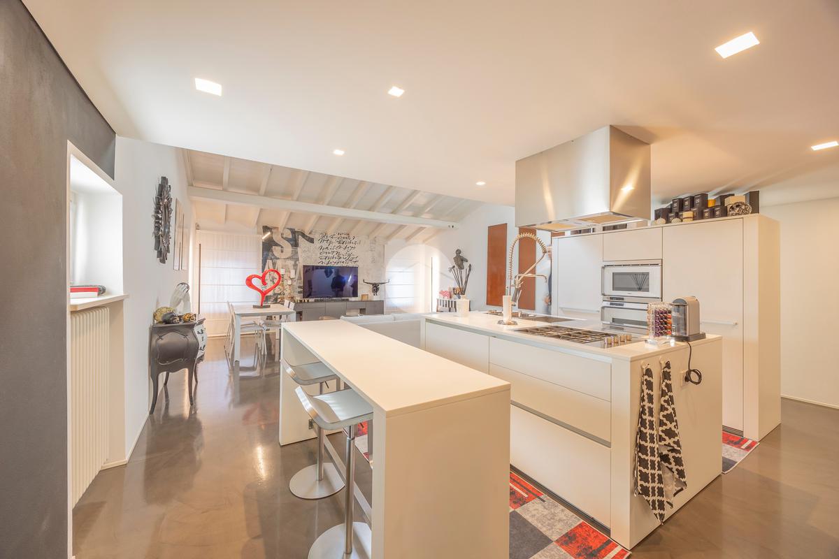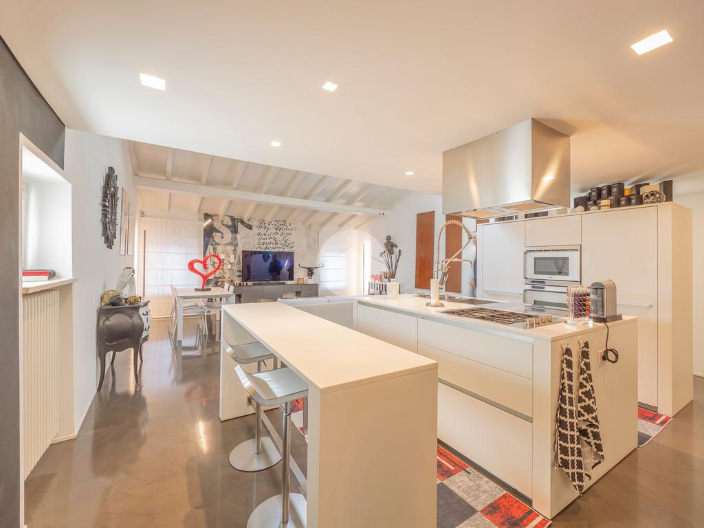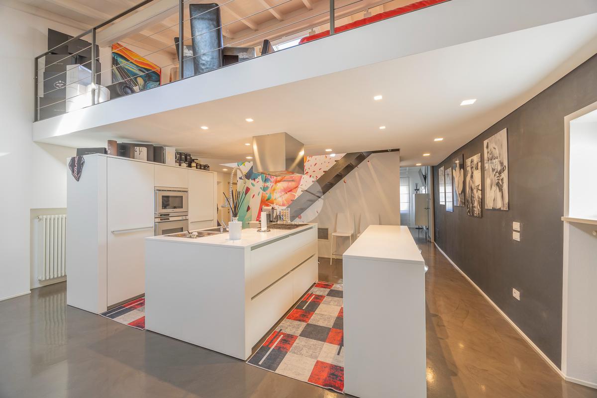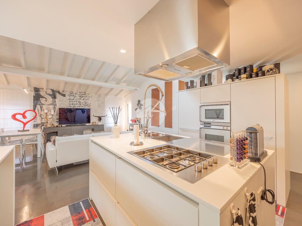 La proprietà si apre su un’ampia zona living openspace con cucina a vista, dove le linee pulite e il pavimento in resina esaltano la continuità degli spazi e la qualità architettonica dell’intervento.